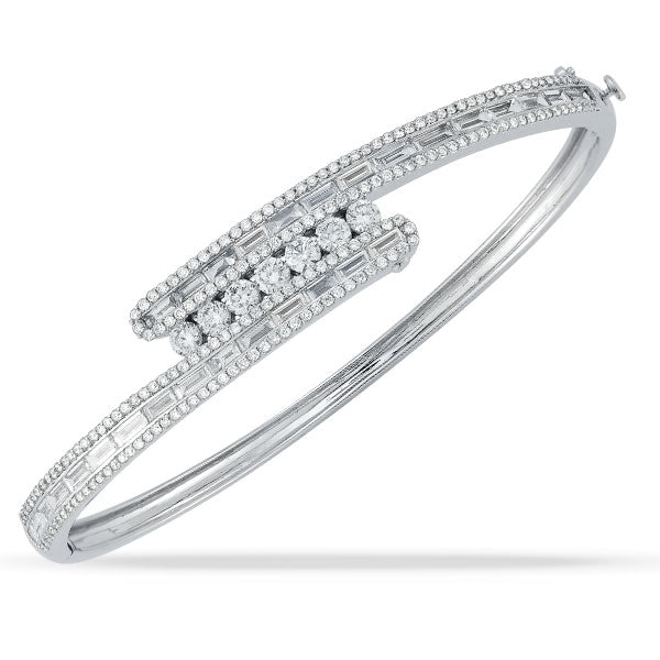 The bangle is fashioned in a bypass design, featuring round and baguette cut lab grown diamonds. The baguette cut diamonds are channel set halfway down each side, accented with a halo of round brilliant cut diamonds. There is a center row of tension set round diamonds at the top acenter of the bypass. The piece is completed in 14K white gold, measuring for a standard 7 inch wrist and hiddden hinged closure.