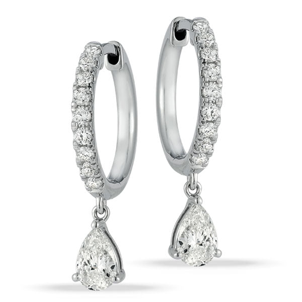 The pair features round brilliant cut and pear shaped lab grown diamonds. Each earring is fashioned in a hoop design, lined along the front with round diamonds. There is a single prong set pear shaped diamond that dangles below each hoop. The pair is held with hinged hoop closures in 14K white gold.