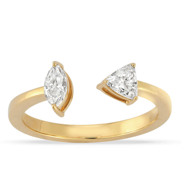 The band features one trillion cut and one marquise shaped lab grown diamond. Each stone is prong set on the top with an open center. The band is completed in 14K yellow gold.
