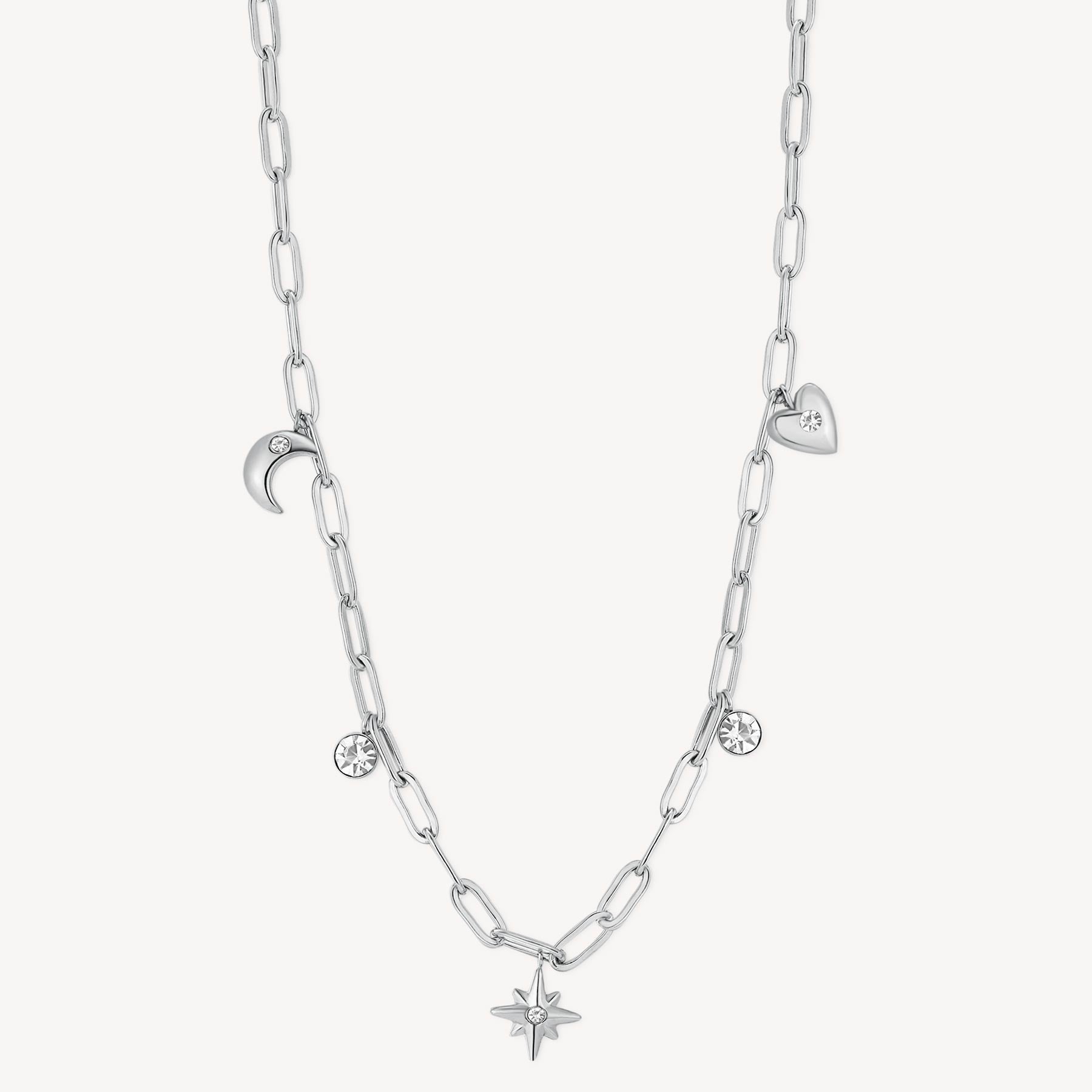 Stainless steel chain necklace accented wtih moon, star and heart pendants with clear crystals. The necklace is completed to an 18 inch length.