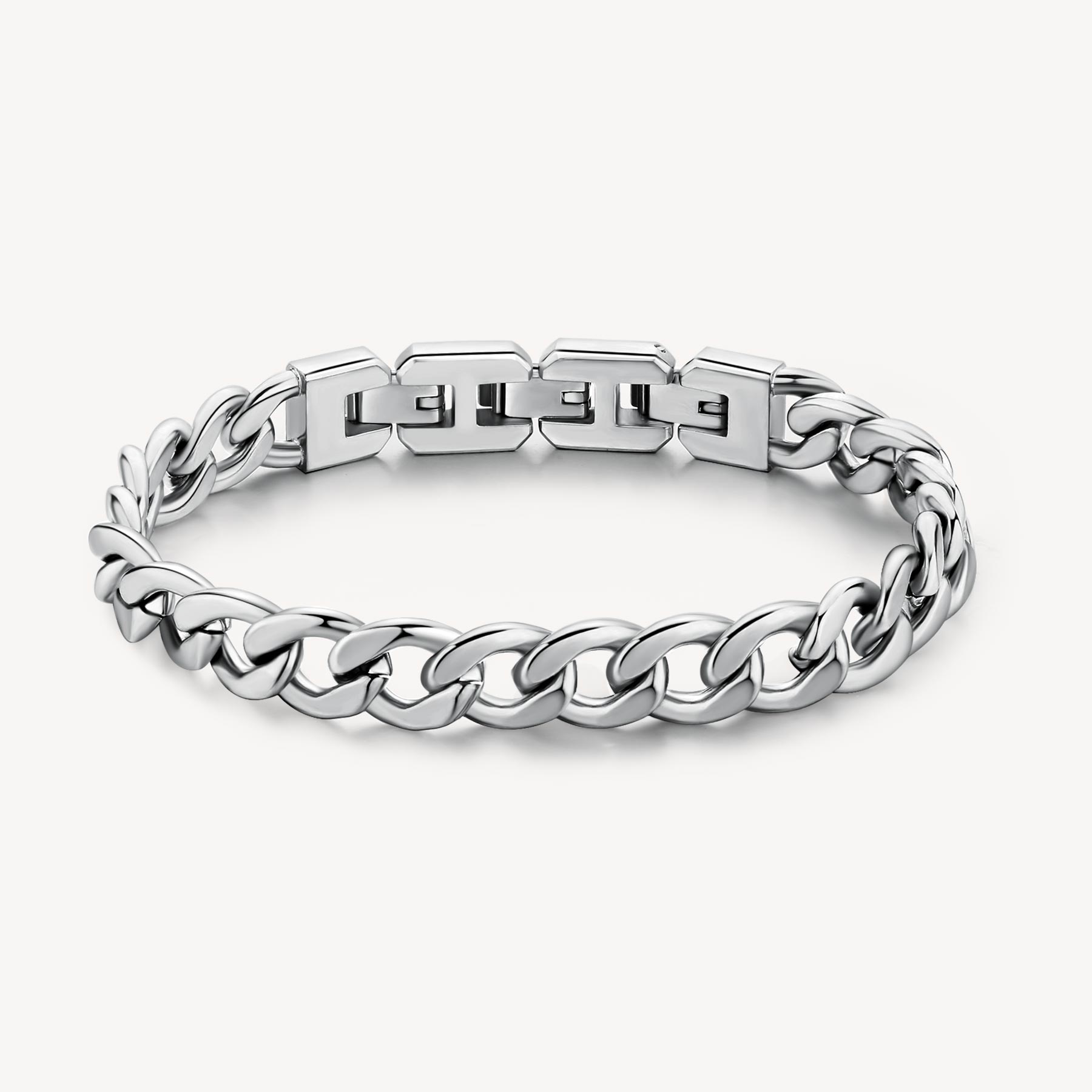 Stainless steel open curb link bracelet. The bracelet is completed to an adjustable 8.5 inch length with removable links.