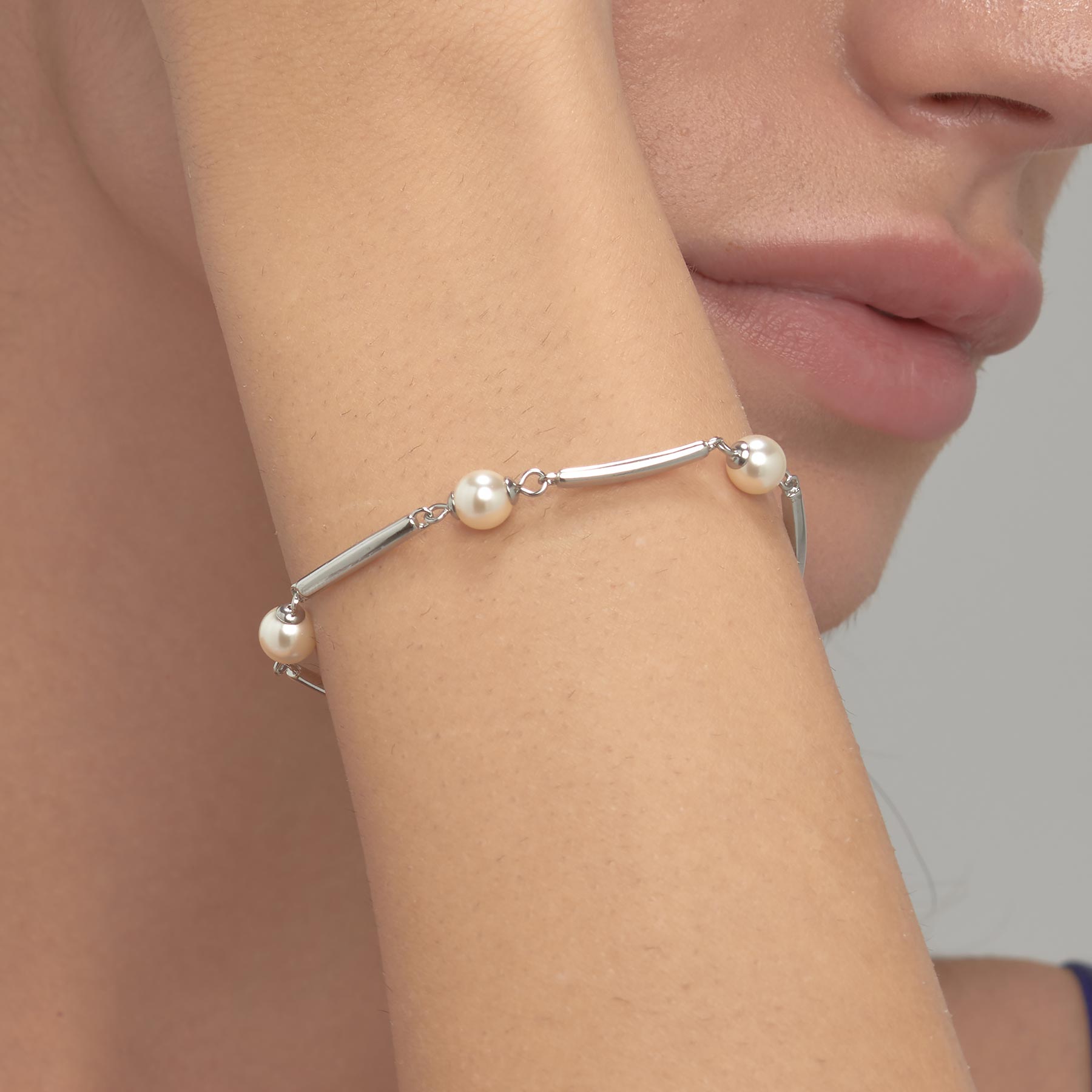 Stainless steel link bracelet is accented with round pearls, separated by elongated bars. The bracelet is completed to an adjustable 7 inch length.