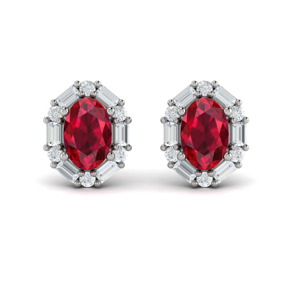 The pair consists of two oval red rubies, round brilliant cut diamonds and straight baguette cut diamonds. The pair is fashioned in a hexagon halo stud design, featuring an alternating halo of round and baguette cut diamonds. Resting in the center of each halo is one oval ruby. The pair is held with friction posts and backings in 14K white gold.