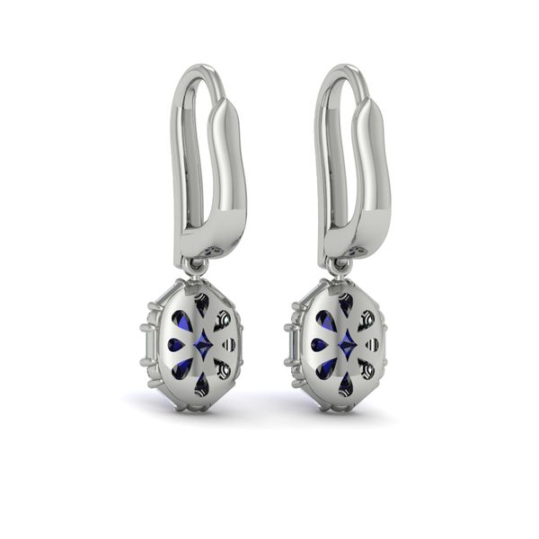 The earrings are fashioned in a drop design. The top of the pair features a hoop style top, lined along the front with French set diamonds and held with latch backs. The drops each are fashioned in a hexagon halo design, featuring alternating round and straight baguette cut diamonds. Resting in the center of each halo is one prong set oval blue sapphire.