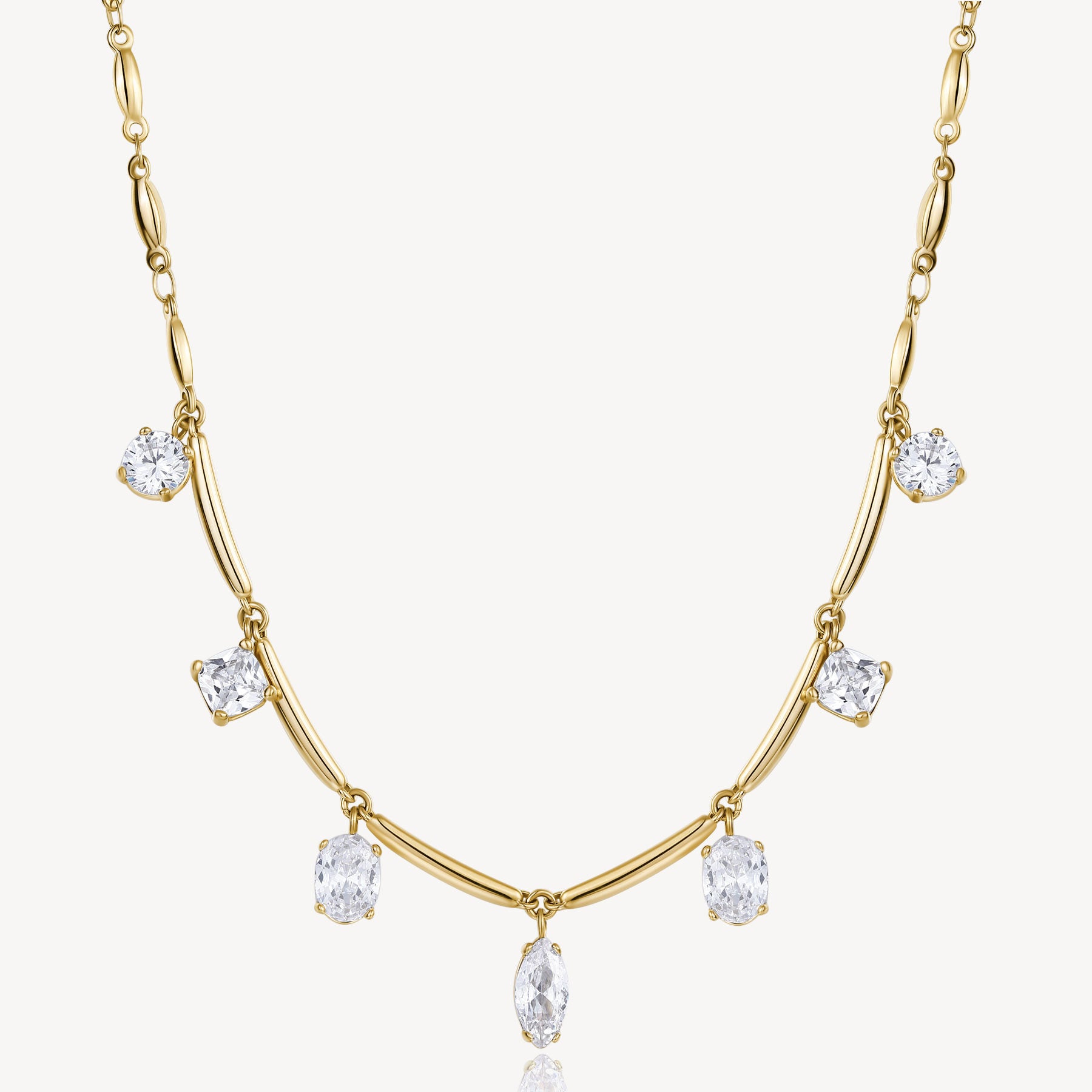 Stainless steel seven-stone necklace with various shaped cubic zirconia, finished in 14K gold plating. The necklace is completed to an adjustable 18 inch length.