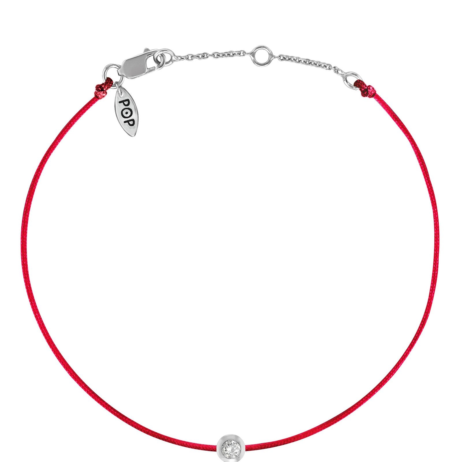 A unique cord bracelet accented with a 0.10ct round brilliant cut diamond. The diamond is set in a sterling silver bezel, stationary on a 1mm colored cord. Each POP cord is guaranteed not to break, stretch or fade; built for an active lifestyle.