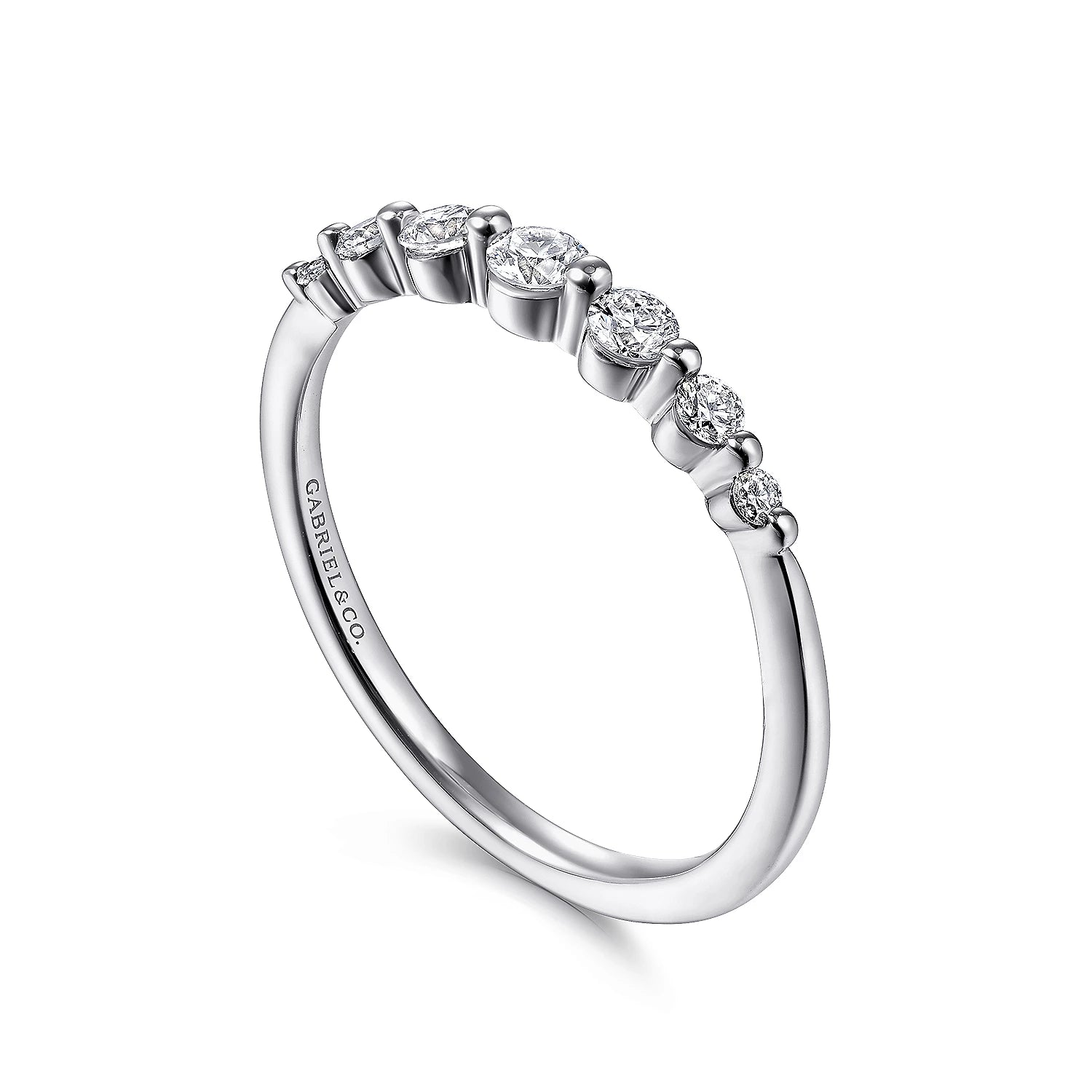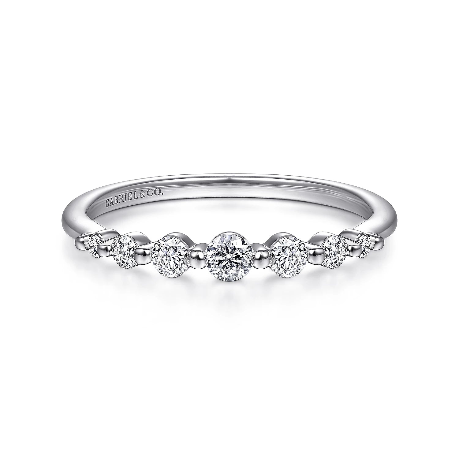 The ring is fashioned with diamonds that are graduated and single prong set across the top half. The ring is completed in a high polished finish in 14K white gold.