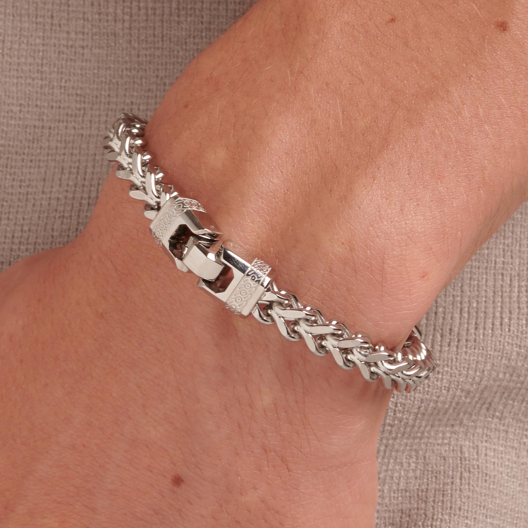 Stainless steel braided style bracelet with a 'knocker' inpsired end and center links. The bracelet is completed to an adjustable 8.5 inch length in gold plated.