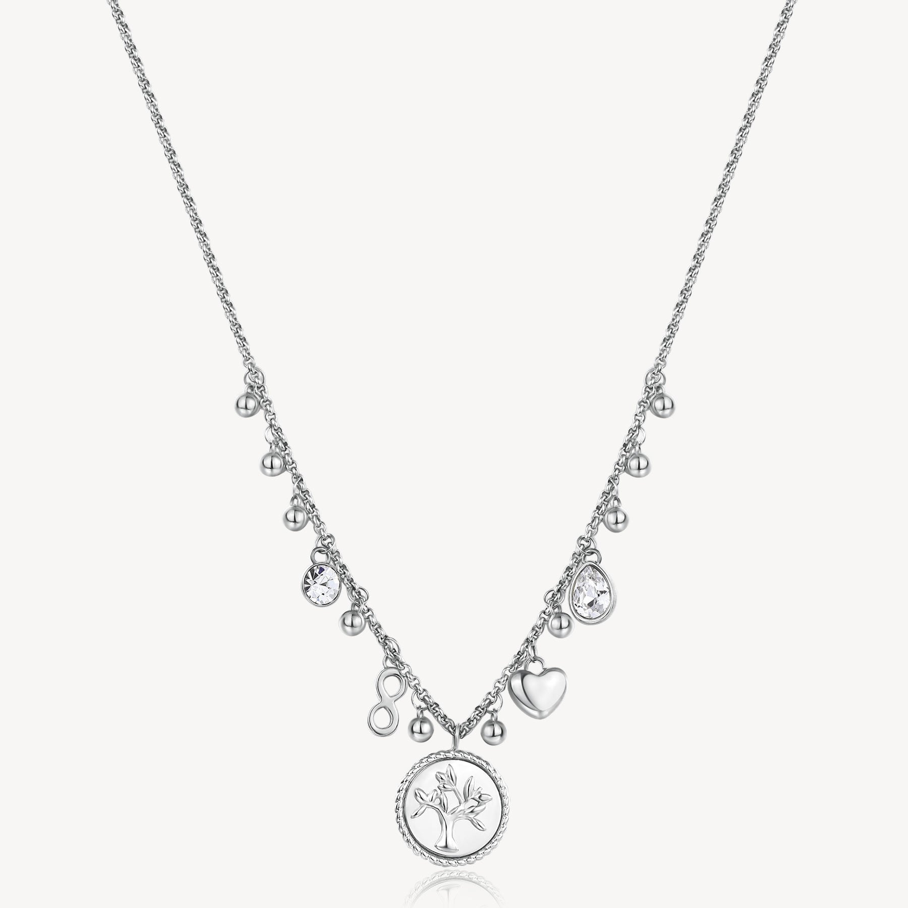 Stainless steel necklace fashioned with the tree of life disc and multi-drop charms. The necklace is completed to an adjustable, 20 inch length.