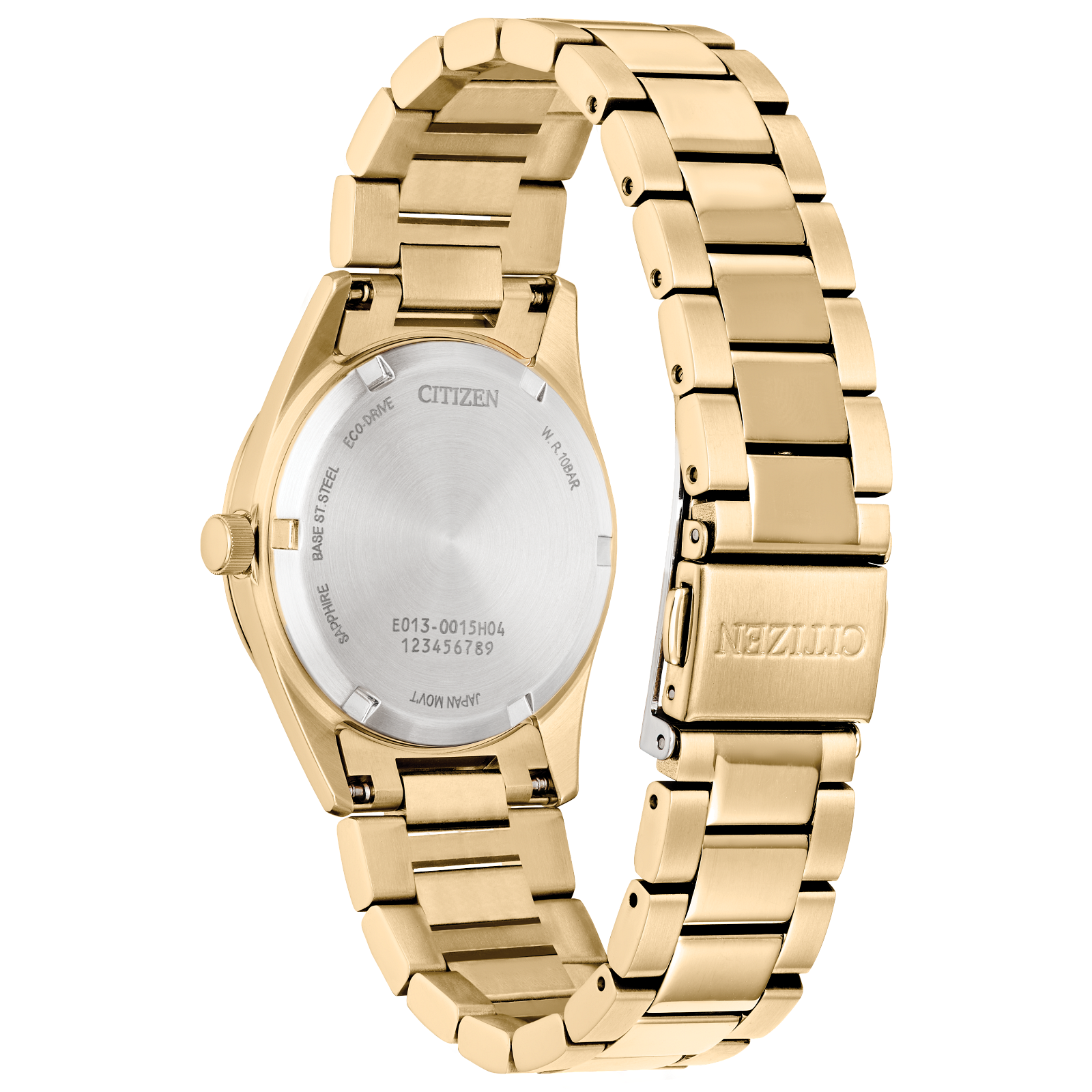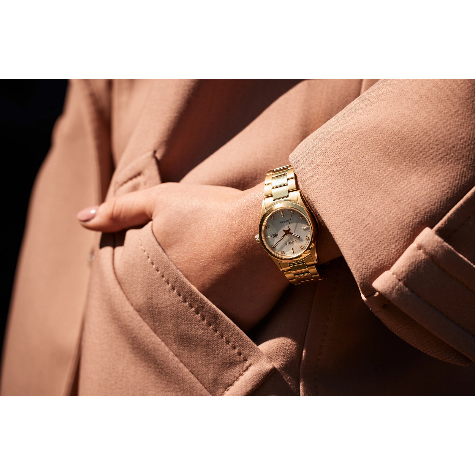 When sporty style meets luxury, you get this latest stunner from Citizen. Joining ready-for-anything wearability with feminine elegance, this time-and-date timepiece is the ultimate day-to-evening watch to wear. The gold-tone stainless steel case measures 33mm in diameter and is presented on a matching, 3-link stainless steel bracelet for a sleek, versatile wear on the wrist. The radiant white mother-of-pearl dial is characterized by its highly legible style and diamond accents, elevating the sporty wearer one step further. A water resistance up to 100 meters helps the dynamic watch maintain a host of functionality without compromising its alluring appearance. Powered by Citizen’s proprietary Eco-Drive technology to provide light-powered vitality continuously and sustainably without ever needing a battery. Caliber E013.