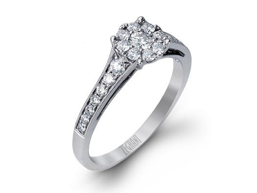 A dazzling cluster diamond ring in 14K white gold. The ring holds approximately 0.50 cts of round brilliant cut diamonds in a prong cluster design. With attention to detail, these pieces are intricate, yet classic for any wardrobe. Stocked Size: 6.5